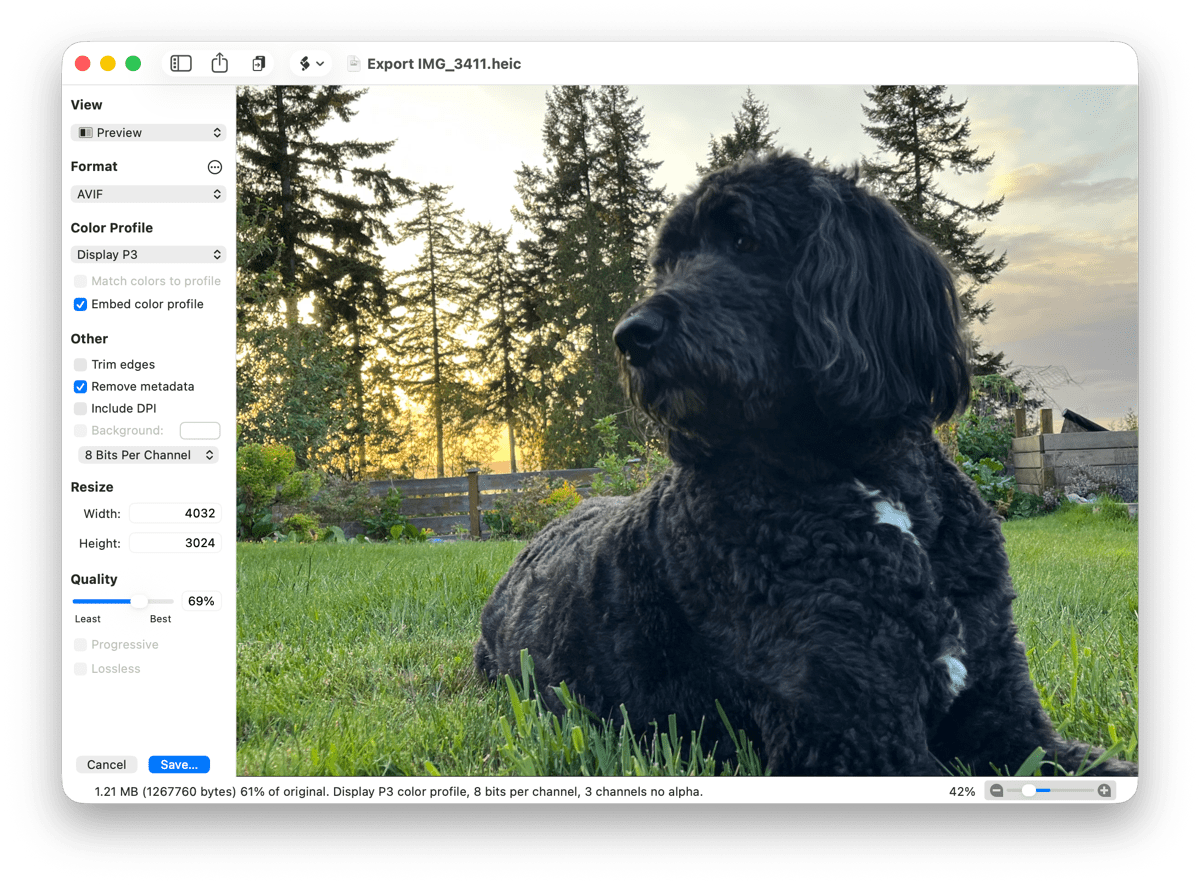 Choosing a format to export your image is as easy as selecting from the list of formats. Some options, such as JPEG and JPEG 2000, will allow you to set how much compression to use via the Quality slider. The higher the quality setting, the bigger the file size. Adjust the quality slider to find the best setting for you. The file size of the current preview is available on the bottom left of the window bar.